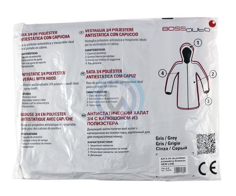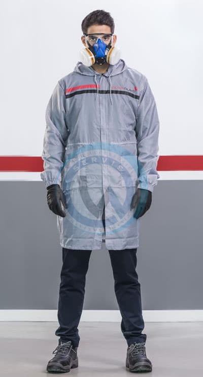 Priedušný polyesterový plášť, ktorý slúži ako ochranná bariéra. Je vyrobený z umývateľného nylonového materiálu.