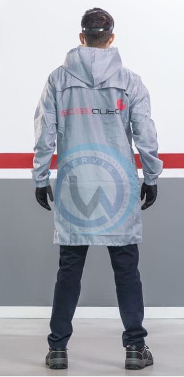 Priedušný polyesterový plášť, ktorý slúži ako ochranná bariéra. Je vyrobený z umývateľného nylonového materiálu.